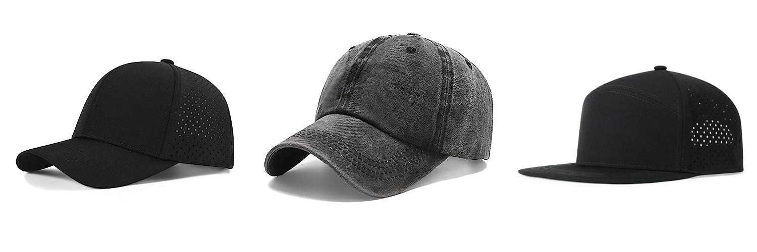 3. FEINION Men Flat Brim Adjustable Performance Hat Snapback Laser Perforated Baseball Cap (Black)