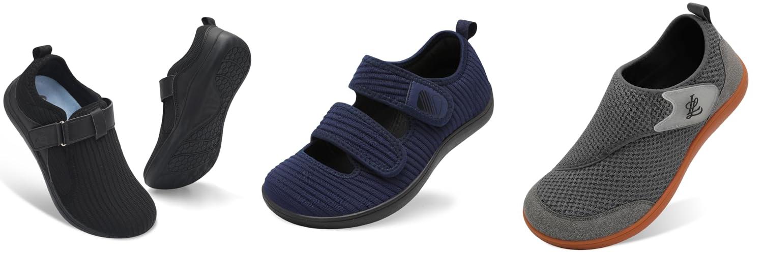 These black, wide-width walking shoes are designed for ultimate comfort and support, especially for those dealing with foot issues. They offer a barefoot feel with a zero-drop sole, making them great for both indoor and outdoor activities. Whether you’re recovering from surgery, managing diabetes, or simply want comfortable shoes, these might be the perfect fit.